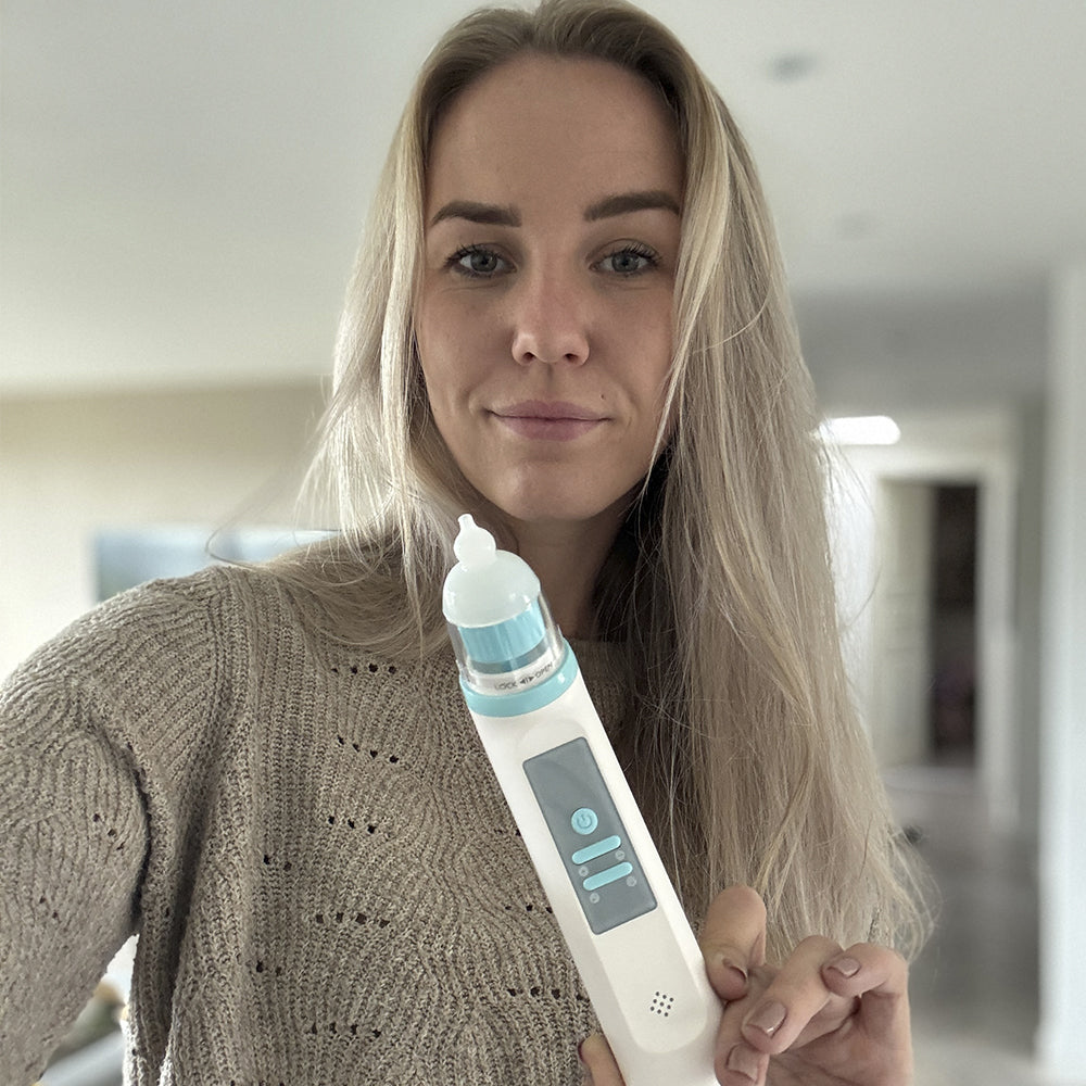 Snotfree har en kraftfuld genopladelig batteripakke, der holder op til 2 timer kontinuerlig brug på en enkelt opladning.