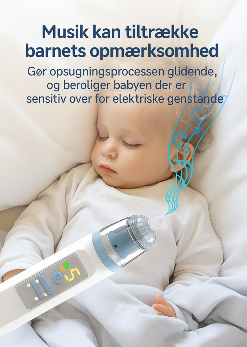 Sørg for, at barnet sidder behageligt, og vælg et passende sugehovede. Tænd enheden, vælg sugestyrke og før næsesugeren forsigtigt ind i barnets næse. Start altid med laveste styrke og øg om nødvendigt. Rens efter brug.